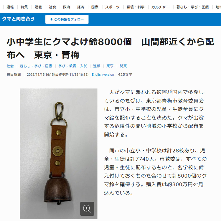 2025年11月19日 最終更新日時 : 2025年11月21日 brainブレイン/熊よけの鈴東京・多摩地域西部【青梅市役所】で弊社の「熊よけの鈴」が採用されました。 東京・多摩地域西部【青梅市役所】で弊社の「熊よけの鈴」が採用されました。(小中学生にクマよけ鈴8000個 山間部近くから配布へ 東京・青梅)